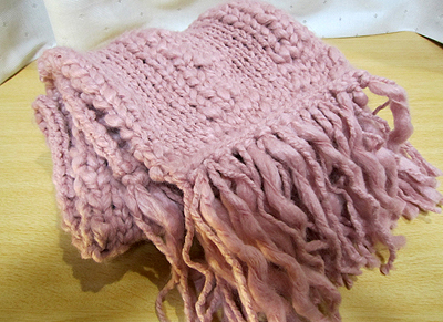 ふさが長めのカジュアル系のマフラーです。 こちらも100円ショップの毛糸で編みました。